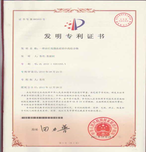 于2010年8月24日向国家专利局申报:“一种治疗高脂血症的中药组合物”国家发明专利,经国家专利局严格审察通过,并下达了《发明专利受理通知书》,专利号:201010261295X,于2010年12月8日在国家知识产权局《发明专利公报》上公开,2011年8月30日已正式授权并下达《授权通知书》,又于2011年12月28日国家知识产权局正式颁发国家《发明专利证书》。一些专利网站和报社已宣传报导。“一种治疗高脂血症的中药组合物”即本发明专利,主要是运用中医中药对高脂血症的病因、病机、病证、病位进行临床研究。标本兼治,气血同调,诸脏相济,配方合理,选药精确,获得了良好的降脂治疗效果,被誉为“高血脂病人的健康保护药”。本研究发明展示了中医中药对血液疾病治疗的新的突破。也丰富了祖国医学文化。在祖国医学发展史上增添了新的一页。今年已被《中国优秀发明大全》和《中国百业功勋人物大典》入编。今年4月被全国高科技成果转化研究中心技术创新专家委员会“评定为:全国高科技应用成果,企业技术创新基地重点推广项目”。并发予《证书》通告。