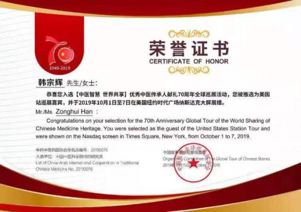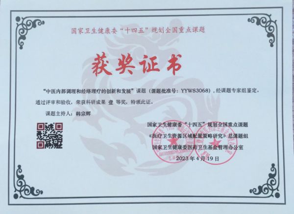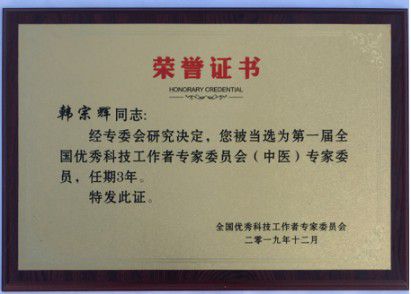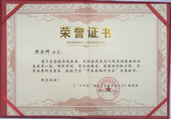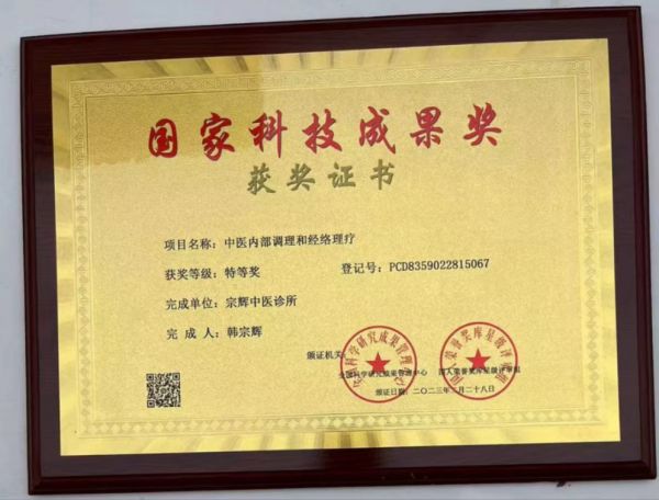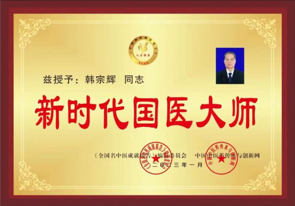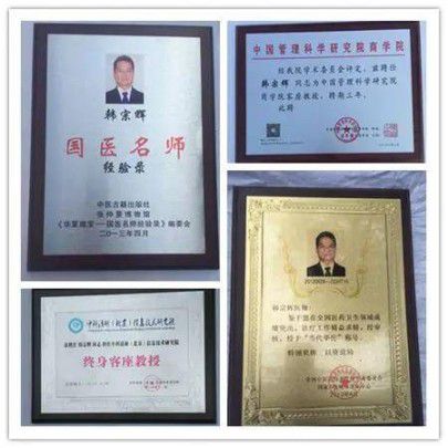 韩宗辉医生被国家授予:国医名师,国医功勋奖,医圣宝鼎医学贡献奖,“当代华佗”医师称号,中华特色优秀医师,优秀论文奖,中国时代改革创新百佳先锋人物。中医康复治疗资深首席专家,中华医学国际发展联合会专家,中国中医科学院研究员,中华医学科技奖一等奖,当代百佳优秀名医,2015度科技人物奖,全国“传统中医百位名医’荣誉,中国科学家协会专家委员会第一届专家委员,中科清研终身客座教授.2017 年国家级科学家挂历荣誉,2012年至2017全国优秀科学家奖,中国科学家协会专家委员会第一批专家委员, 荣获2018年世界中医医药杰出贡献奖和创始人金奖,荣获2018 年和2019年全国人大“两会当代科学家特刊、荣获2019 年首届全国最美中医传承道德模范人物等等,整体的治病,所开的中草药和经络处理都是整体的调理,标本兼治,加强整体来解毒消除炎症和经络疏通。