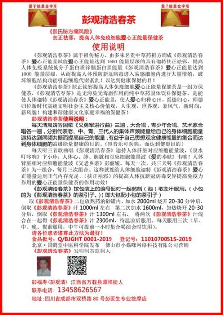 由此可以提出以《彭观清浩春茶》愛心正能量图对《彭观清浩春茶组方》迦持《彭观清浩春茶》愛心正能量,1000能量层级以上,使人体组织器官细胞结构功能修复正常,达到恢复健康状态目的,同时还要与迦持管理接受信任《彭观清浩春茶》愛心正能量图修为生活饮食起居习惯,运动锻炼相结合的康复系统工程工作,修为在于给人与愛心正能量,善良、慈悲心、归种心田,必须坚持,勤修迦持听《泉水叮咚响》《愛的奉献》《父老乡亲》三首歌曲,使人体精神,细胞能量,心态静达,安心,气顺达到同频共振的《彭观清浩春茶》愛心正能量的跃迁,基态,稳态的叠迦程序工作系统工程,即内外环境达到同频协调共振的阴阳和偕能量,即人体的精气神的开悟状态!这样人体也就有足够的愛心正能量迦持管理自身细胞能量,达到正常健康状态,(此时为高级能量体了)。(一般是7天,21天,49天,98天,108天)(即为圆成高能量跃迁礼成时间)以后每天只要唸三句《彭观清浩春茶》愛心正能量图,修复迦持我的细胞结构功能健康状态,即可以!每月坚持喝三次《彭观清浩春茶》即可以达到廷年益寿的目的,(相对平均增加30年寿命)在当今新冠病毒及其变异病毒全球感染传播的之际,健康宣传大使以及中国民间中医医药研究开发协会。(金骏眉·铁观音茶叶固体饮料)(彭氏秘方痛风散)在全国推广饮用,以提高全国人民人体细胞的能量《彭观清浩春茶》愛心正能量达到1000能量层级高级能量体,从而可以以虚静迦持《彭观清 浩春茶》愛心正能量自己管理掌控自己身体细胞能量在健康状态下运行,以达到迦特细胞愛心正能量,提高人体免疫细胞的正能量、低分子蛋白质38460道尔顿(Da)起到免疫的预防能量层级,达到预防新冠病毒及其变异病毒的目的!同时还具有修复受损细胞的结构系统功能的能量层级进行组织细胞结构功能修复,以解决新冠病毒感染者的后遗症!这是人民身体健康的需要!也是全人类走出人与自然千年能量转化升级必由途径的需要!善良慈悲,愛心正能量,通过《彭观清浩春茶》愛心正能量图,使人类心态思想观念,善良心,慈悲心,愛心正能量归种心田,医德归心,师德归位!人类要守道尊德,德是愛心,道是能量所以愛心正能量就是遵德守道,才是人间正道。为了人间正道光明,推荐大家饮用《彭观清浩春茶》愛心正能量图,金骏眉,铁观音《彭氏秘方痛风散》《彭观清浩春茶》固体饮料饮茶。信任能量就是遵守道德规律,这是真正的科学,只是人们没有从这个观念角度去探索它的规律系统,有分支,没有统一,我只是告诉人们遵守规律达到统一的观念方法,修为要靠大家,靠每一个人自己的勤奋修为!靠天靠地都不可靠,人类是地球,宇宙,空间的主宰者,所以只有靠人,靠自己,靠团结,靠人类智慧修为能量——愛心正能量,运用能量调配人自己与自然和谐相处的资源财产经济调配平衡能量,达到《彭观清浩春茶》愛心正能量图迦持《彭观清浩春茶》愛心正能量,达到人体健康是维一的状态目的!