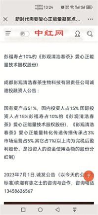 成都彭观清浩春茶生物科技有限责任公司:国有资产占51%,国内投资人占15%,国际投资人占15%,彭福寿占10%,愛心正能量的转化传递传播传承占3%,市场运营占5%,其他占1%(以上均为完税后盈利,是投资人的资金使用金额的股份分红制)2023年5月27日诚发公告,欢迎有志之士的咨询与合作!咨询电话:13458626567。